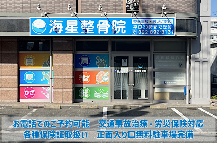 海星整骨院は福岡市西区福重2丁目に開院しています。お身体の不調や痛みがございましたらお気軽にご来院ください。正面に無料駐車場完備